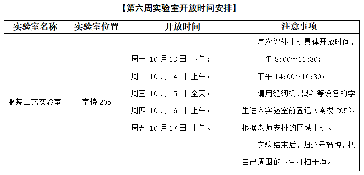 2025-2026(1)学期服装工艺实验室课外开放时间安排