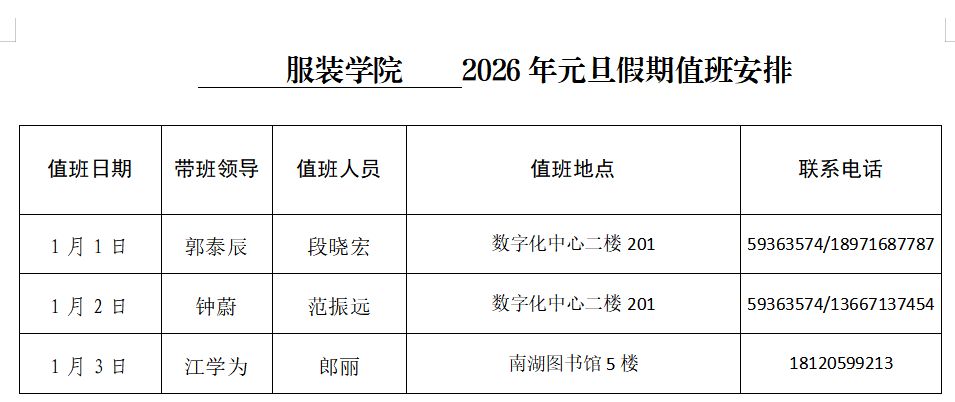 服装学院2026年元旦假期值班安排