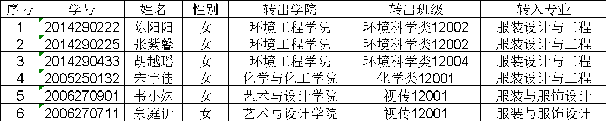 按照学校教务处下发《关于2020-2021学年第二学期转专业工作的通知》精神的要求,服装学院坚持公开、公平、公正的原则,结合学院教学资源实际情况,充分尊重学生的个性发展和专业选择,认真组织并完成了本次转专业工作,现将2020级转专业学生名单公示如下: