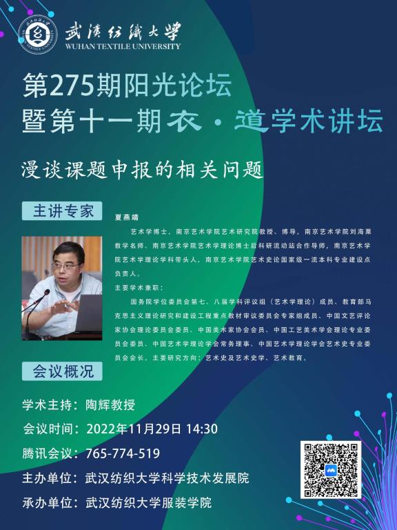 讲座预告:第275期阳光论坛暨服装学院第十一期衣·道学术论坛