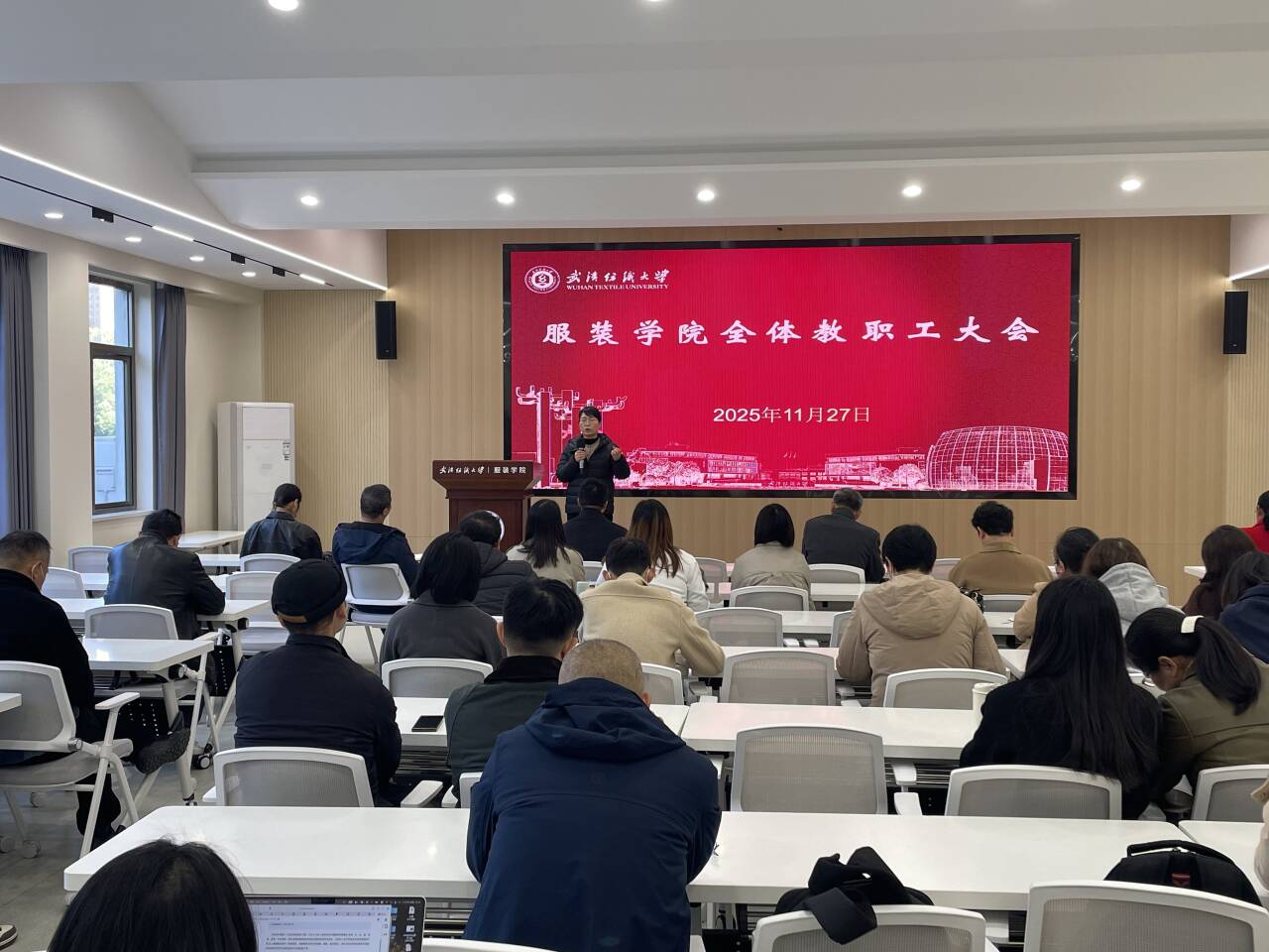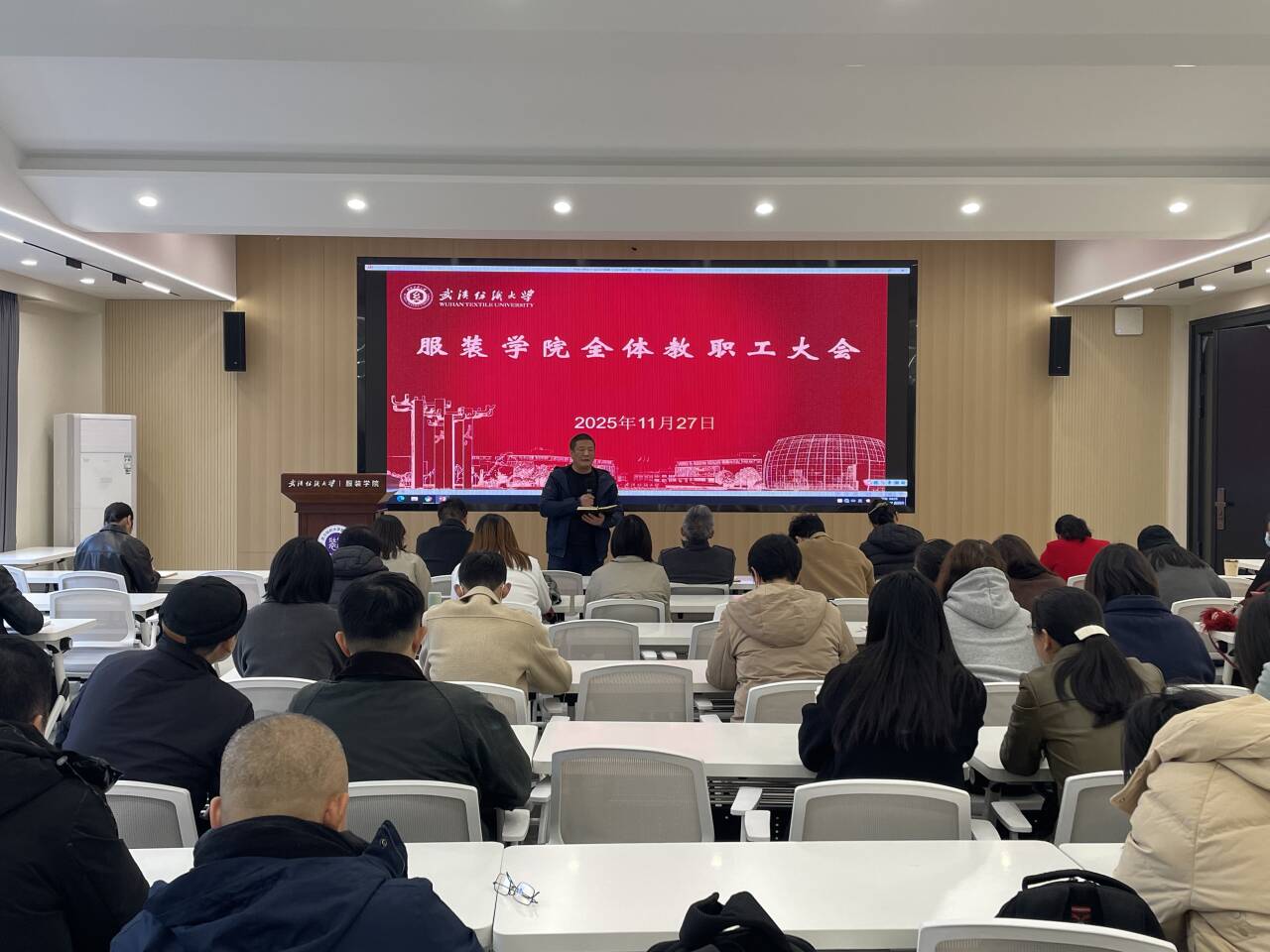 11 月 27 日下午,服装学院在综合楼二楼学术报告厅召开全院教职工大会,学院领导班子成员及全体教职工参会。会议由院长陶辉主持,聚焦教学科研、人才培养、毕业生就业以及学生安全稳定等核心工作,系统部署近期重点任务,强化责任落实,为学院高质量发展和学校 “双一流” 建设筑牢根基。