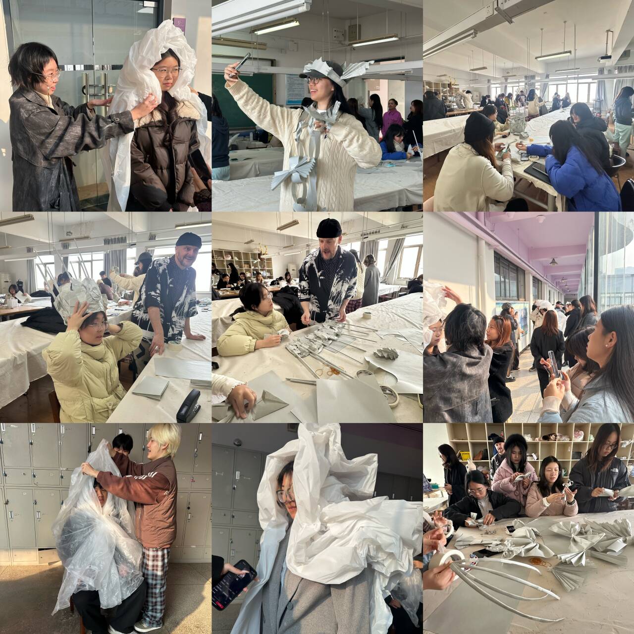 在第二阶段,Philip 老师向学生分发 A3 尺寸的环保纸张,鼓励大家突破常规,将纸张转化为头饰、包袋或其他身体装饰物。在此基础上,各小组以一名同学为“模特”,结合纸张饰品与大幅环保纸,即兴完成立体服装造型创作。课堂氛围轻松而活跃,学生们在不断尝试中体会到材料实验与身体表达的乐趣。