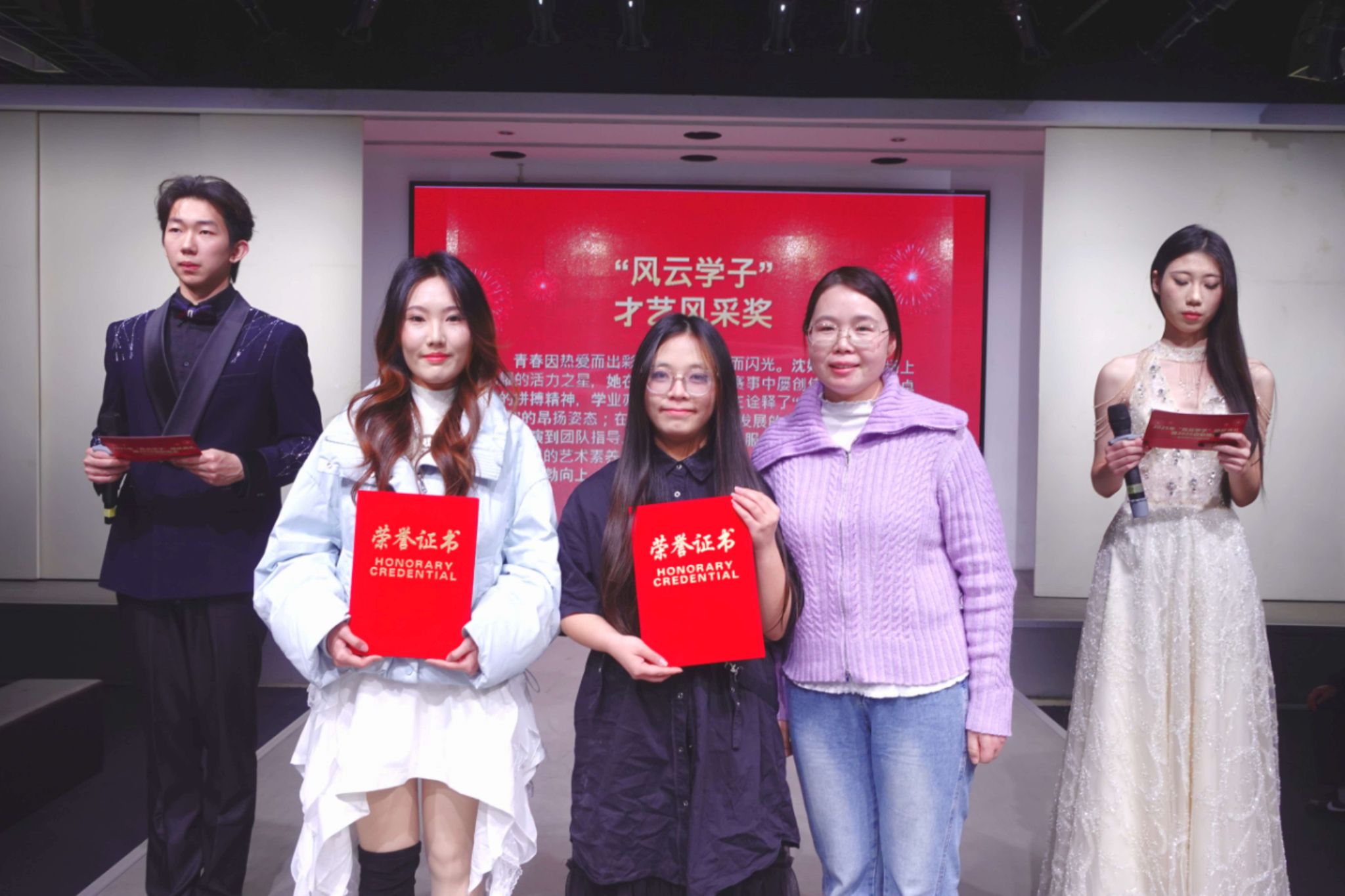 2025年12月30日18时30分,武汉纺织大学南湖校区表演厅内星光闪耀、掌声雷动。服装学院2025年度“风云学子”颁奖典礼暨2026年新年晚会在此隆重举行。研究生部(处)副部长马晓锋,学生工作部(处)副部长夏贤辉,服装学院党委书记杜新年、院长陶辉教授、副院长江学为教授、副院长钟蔚教授、党委副书记郭泰辰、服设三系主任张元美副教授,服工系主任张俊副教授,表演系主任田甜,办公室主任胡琳琳,实验室主任吴胡和出席晚会,学院辅导员、班主任老师们和服装学子们参加了晚会。
