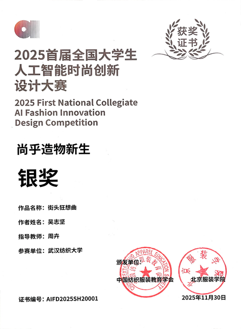 11月30日,2025首届全国大学生人工智能时尚创新设计大赛颁奖典礼在北京国际设计周永久会址举行。大赛吸引了全国110所高校踊跃参与,5个赛道共征集参赛作品3348件,并经过严格的中期评审与终审,125件优秀作品脱颖而出,集中展现了新时代青年在"AI+时尚"领域的前沿探索与创新实力。在本次大赛中,服装学院周卉副教授指导的2023级研究生吴志坚作品《街头狂想曲》获尚乎造物新生赛道的银奖。
