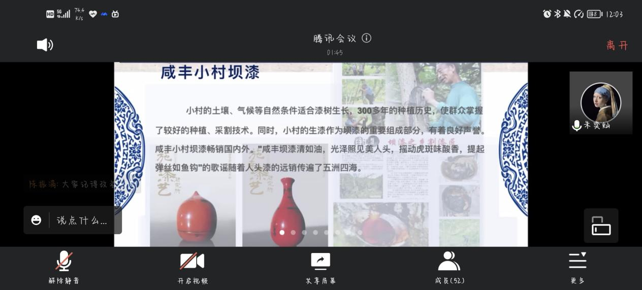 2022年6月4日中午1200,坝漆--追寻城市技艺,守护坝漆之美线上宣讲第三讲在腾讯会议进行,参与的同学以服装学院为主,还有部分感兴趣的其他学院的各年级学生。