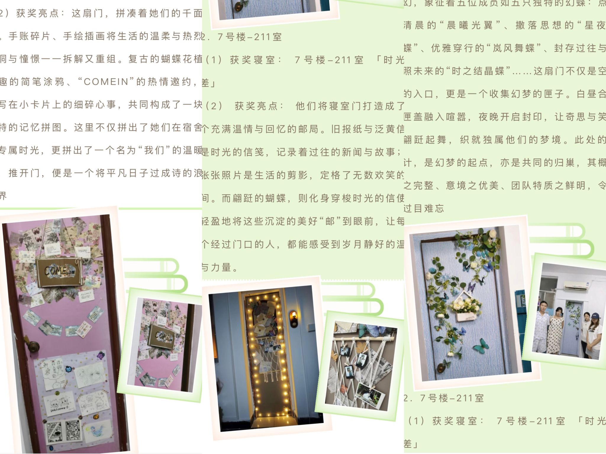 9月24日至10月12日,学院组织新生开展“我‘门’不一样”新生寝室文化活动。活动通过寝室装饰评比、室友互动游戏等环节,引导新生养成良好生活习惯,构建团结友爱的寝室关系。该活动是“阳光护航计划”在生活管理层面的延伸,为新生营造安全、温暖的住宿环境。